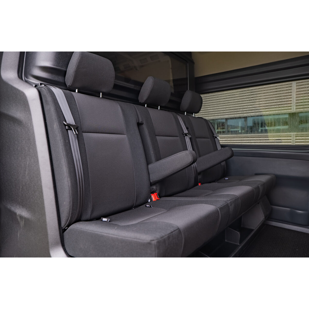 - Drie voorgevormde stoelen voorzien van 3-punts veiligheidsgordels