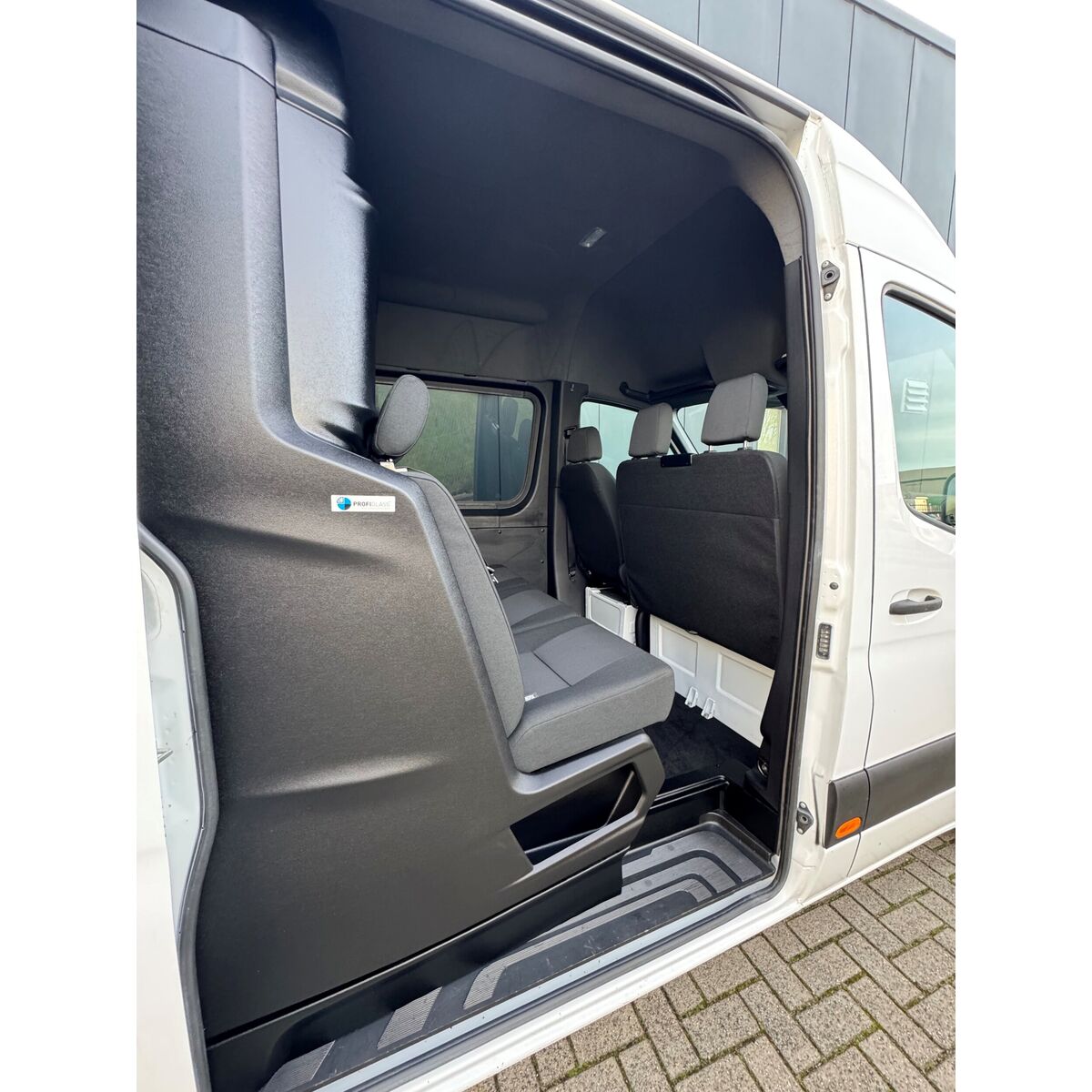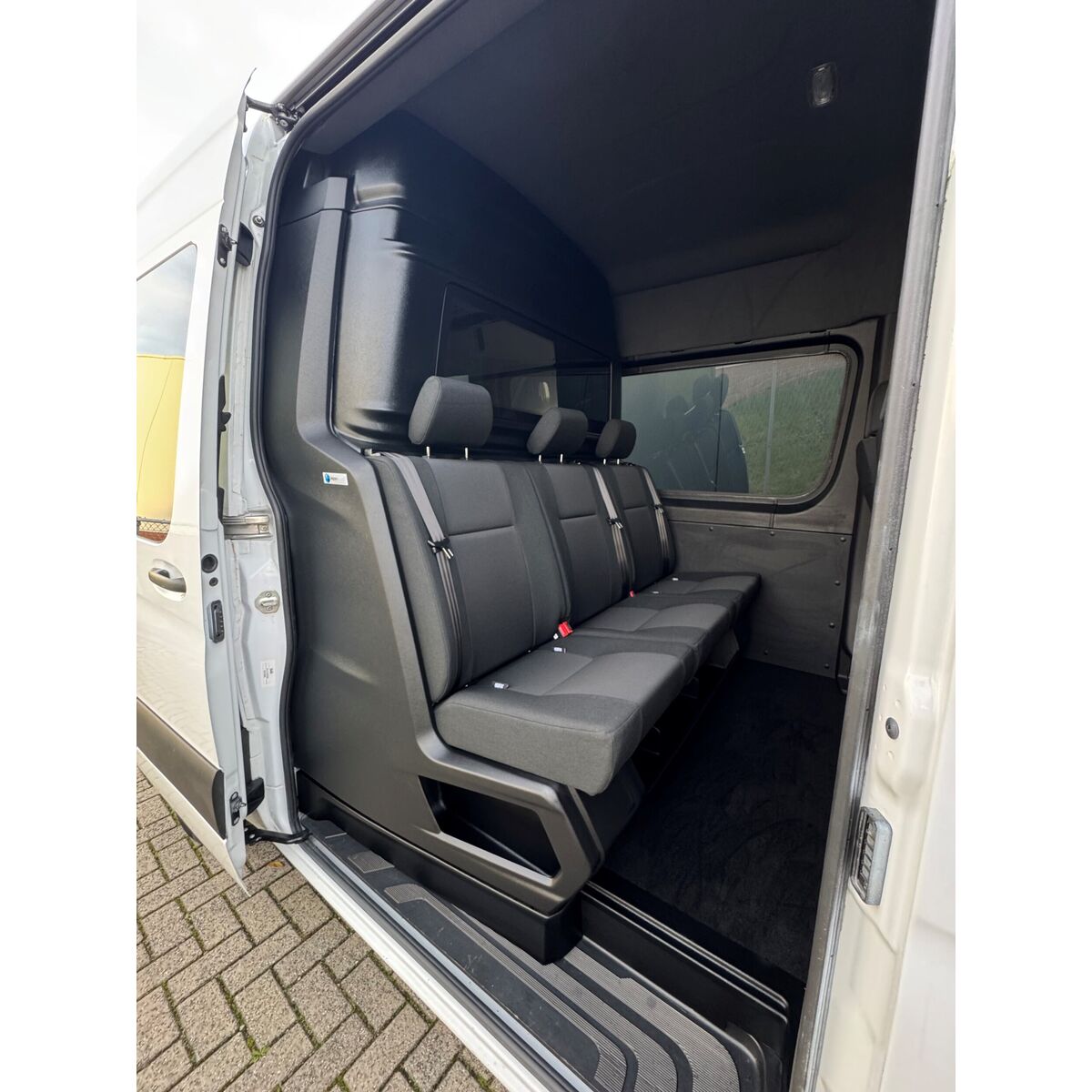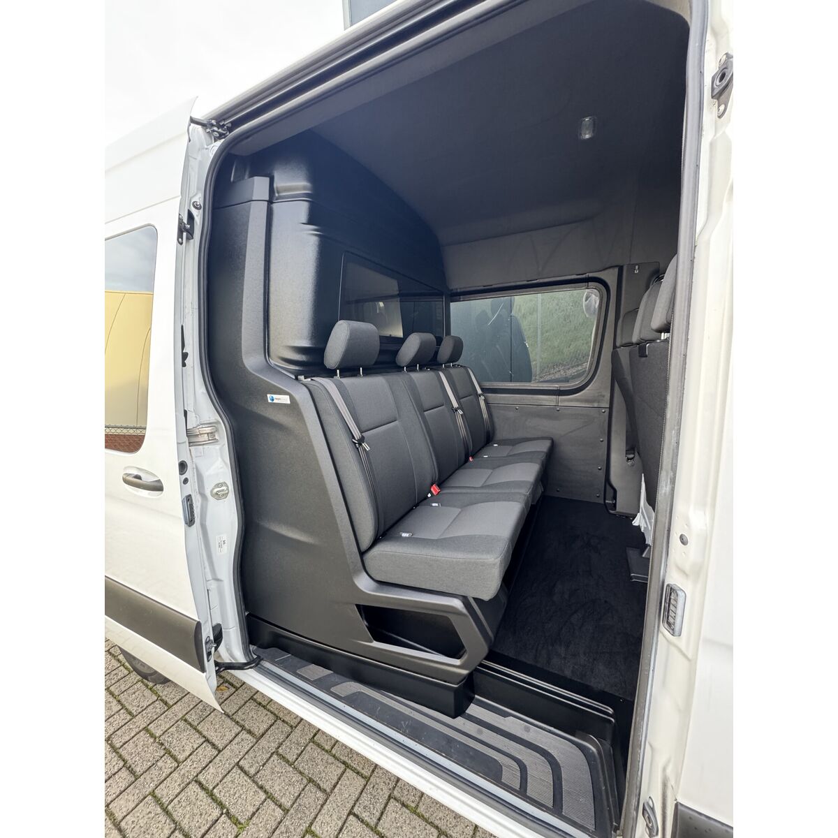 - Drie voorgevormde stoelen voorzien van 3-punts veiligheidsgordels