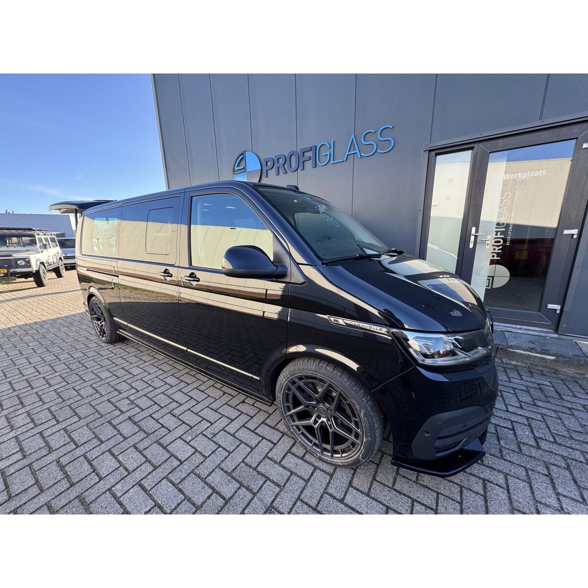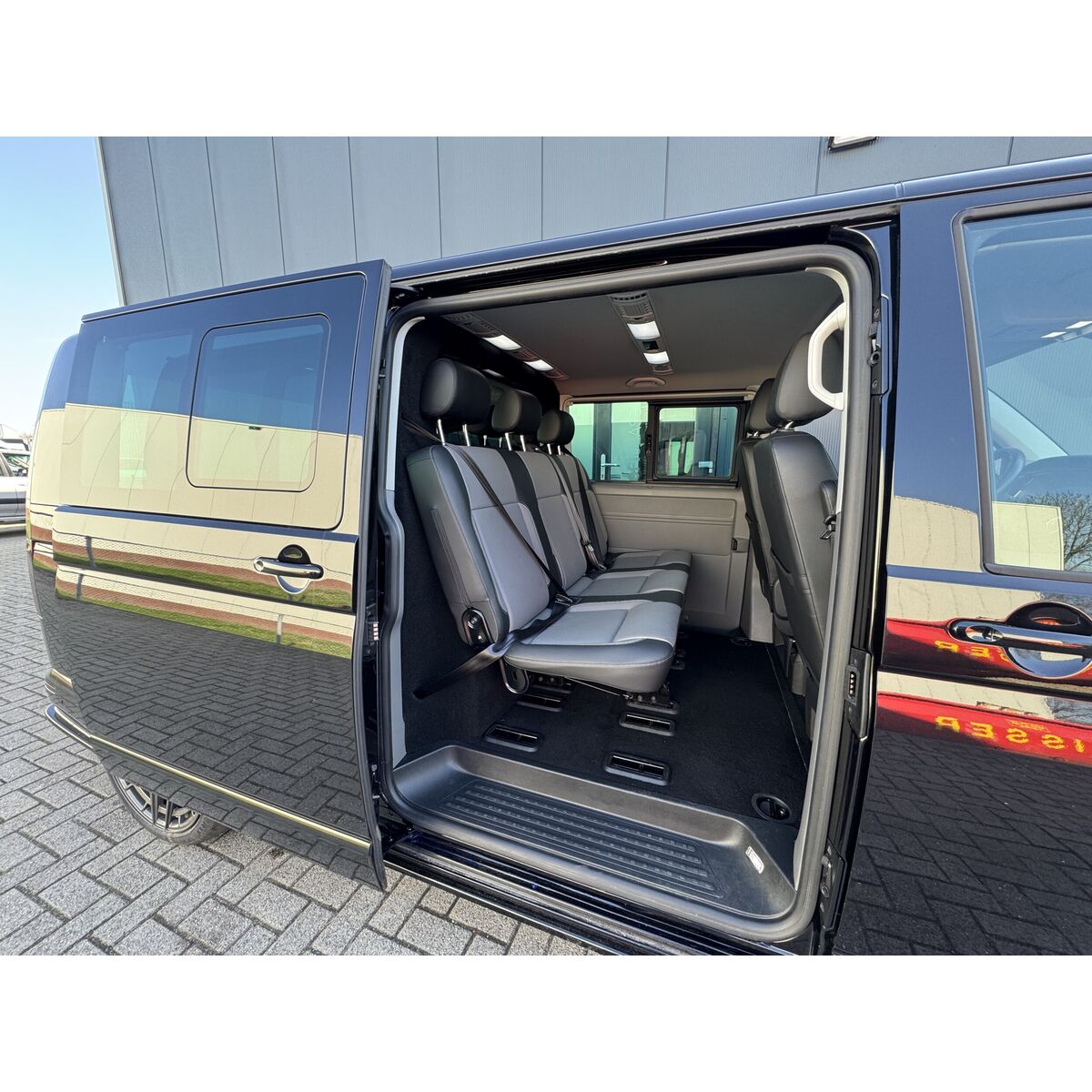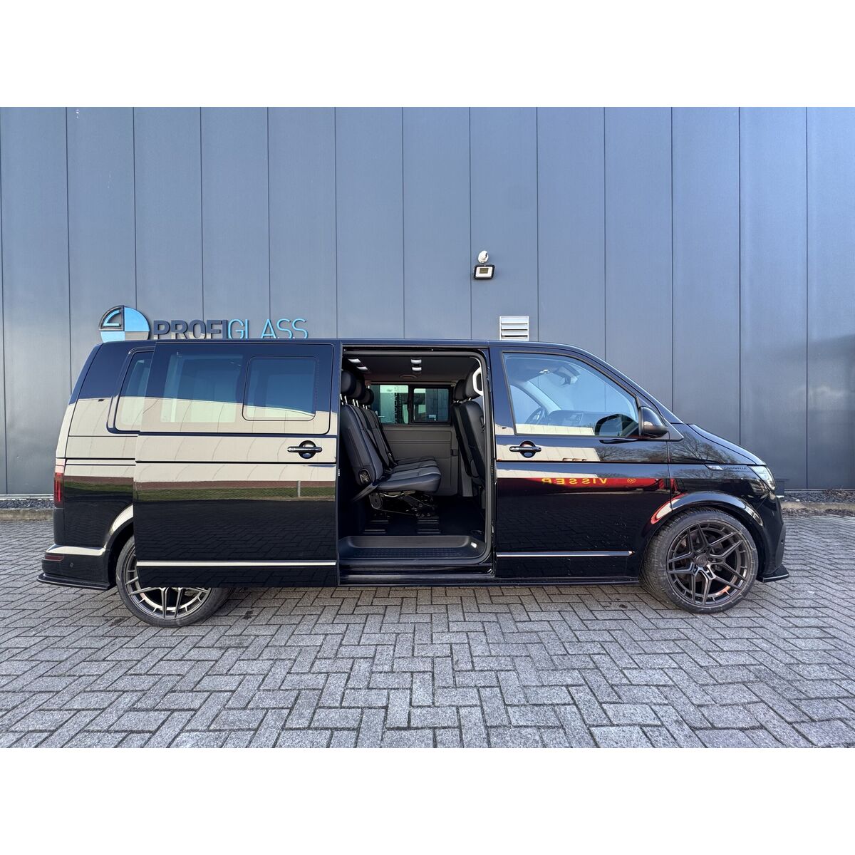 Dubbele cabine voor de Volkswagen Caravelle L2H1, inclusief: ABS dubbele cabine wand met ruit, blinderingspaneel linksachter (hoogglans zwart gespoten) en montage van de bij de auto meegeleverde bank.