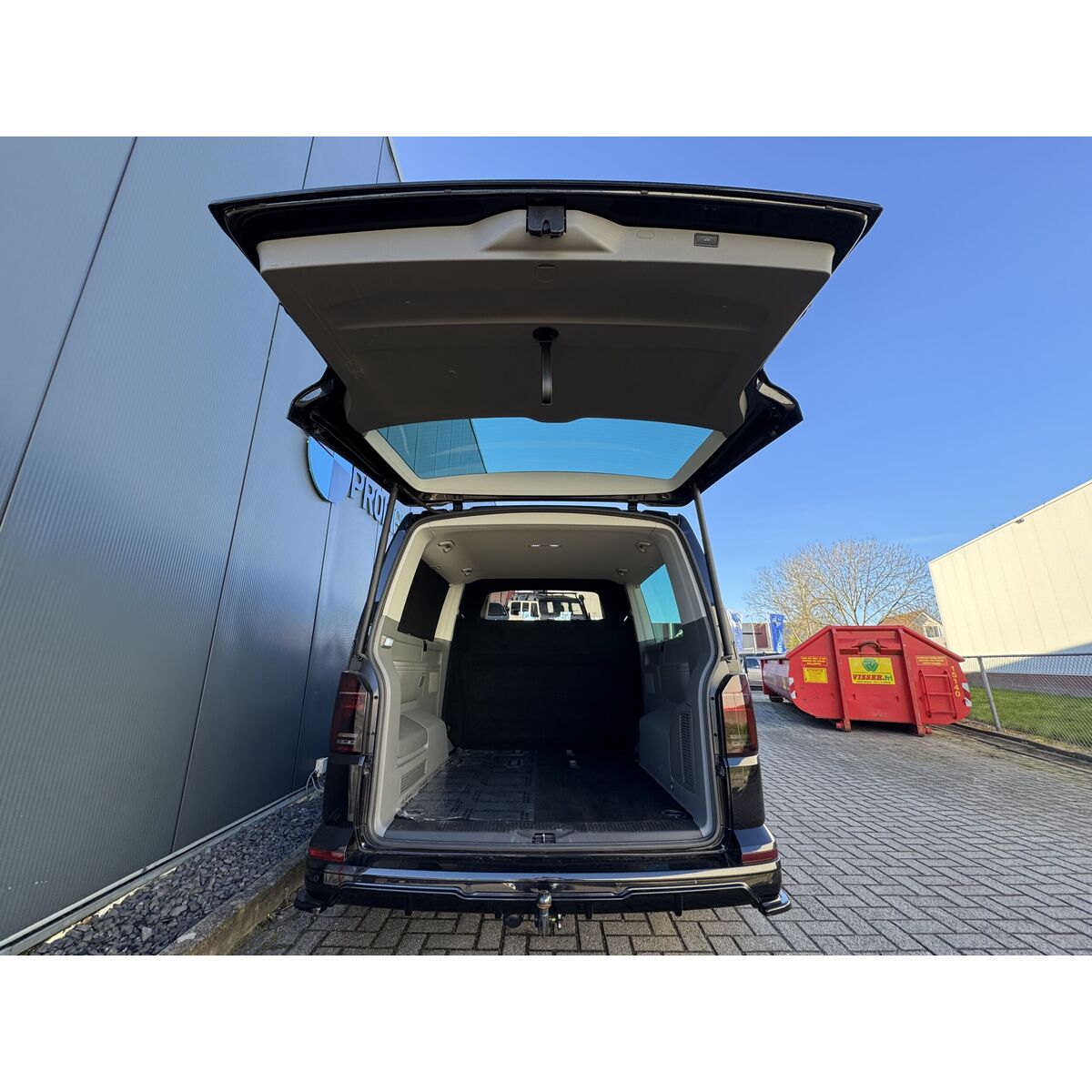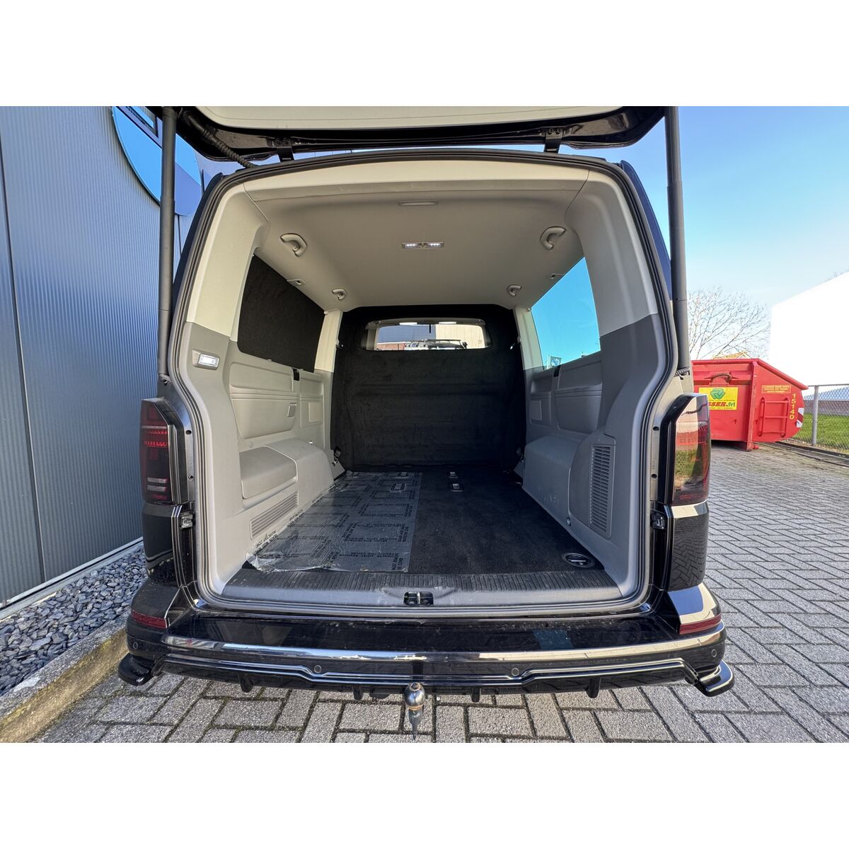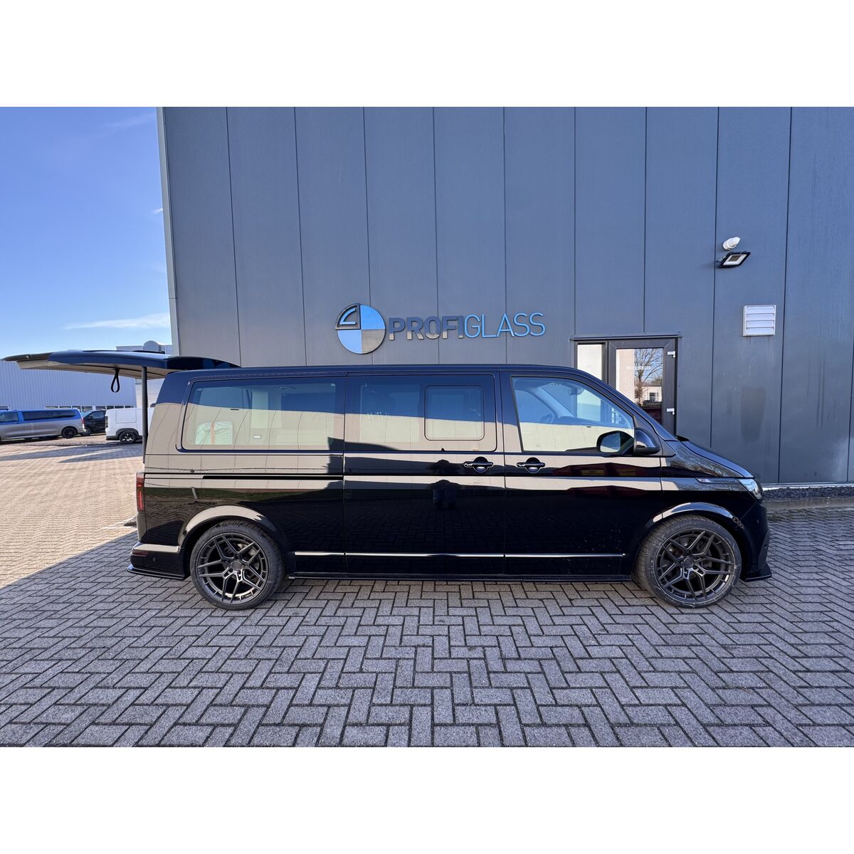 Dubbele cabine voor de Volkswagen Caravelle L2H1, inclusief: ABS dubbele cabine wand met ruit, blinderingspaneel linksachter (hoogglans zwart gespoten) en montage van de bij de auto meegeleverde bank.