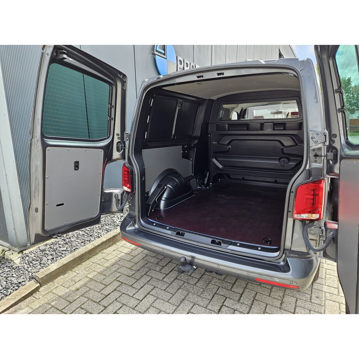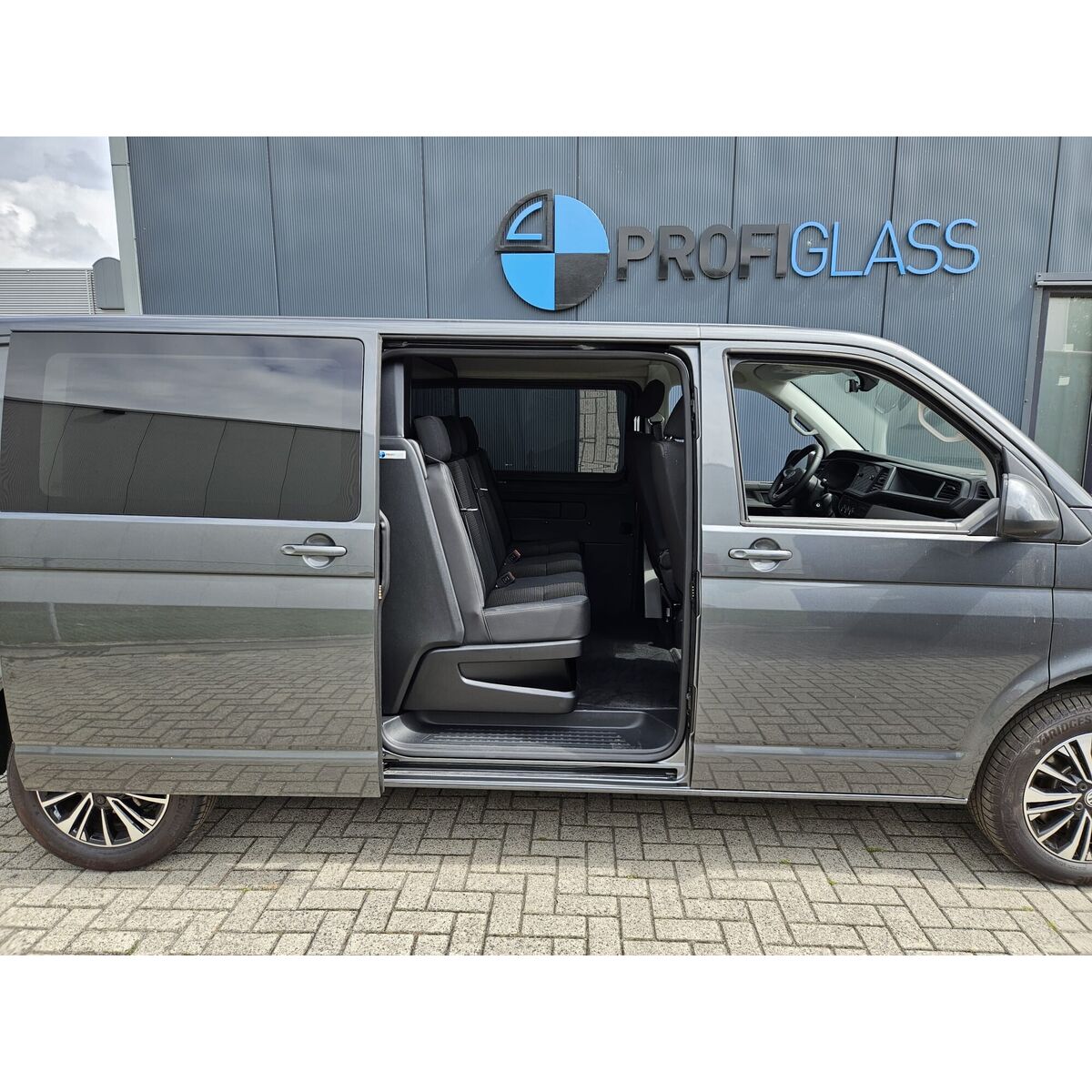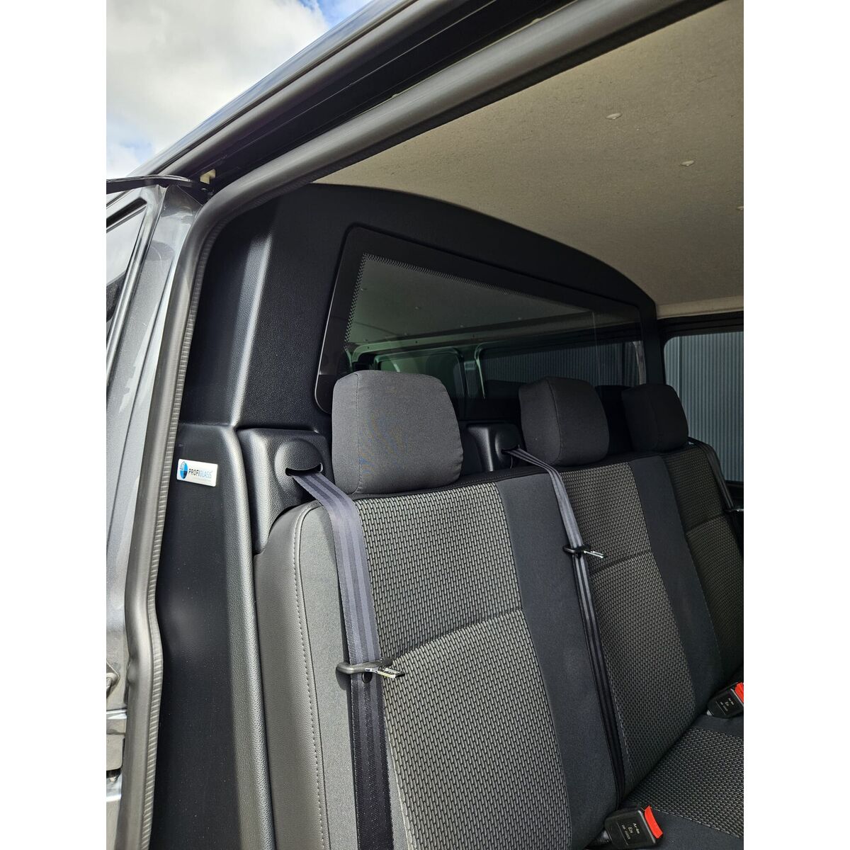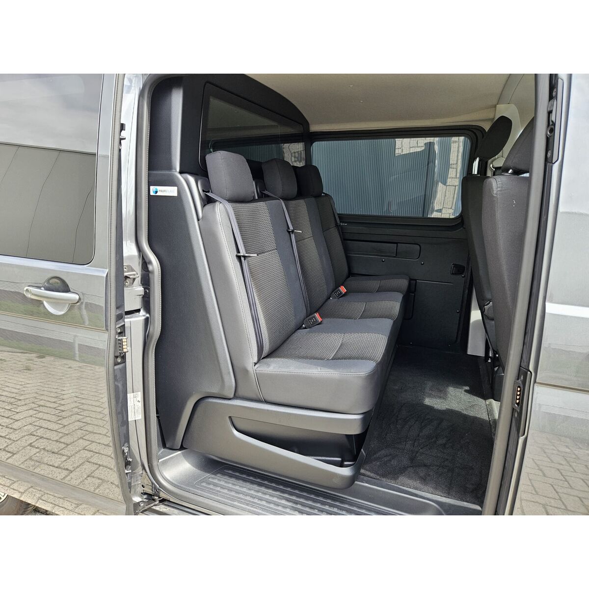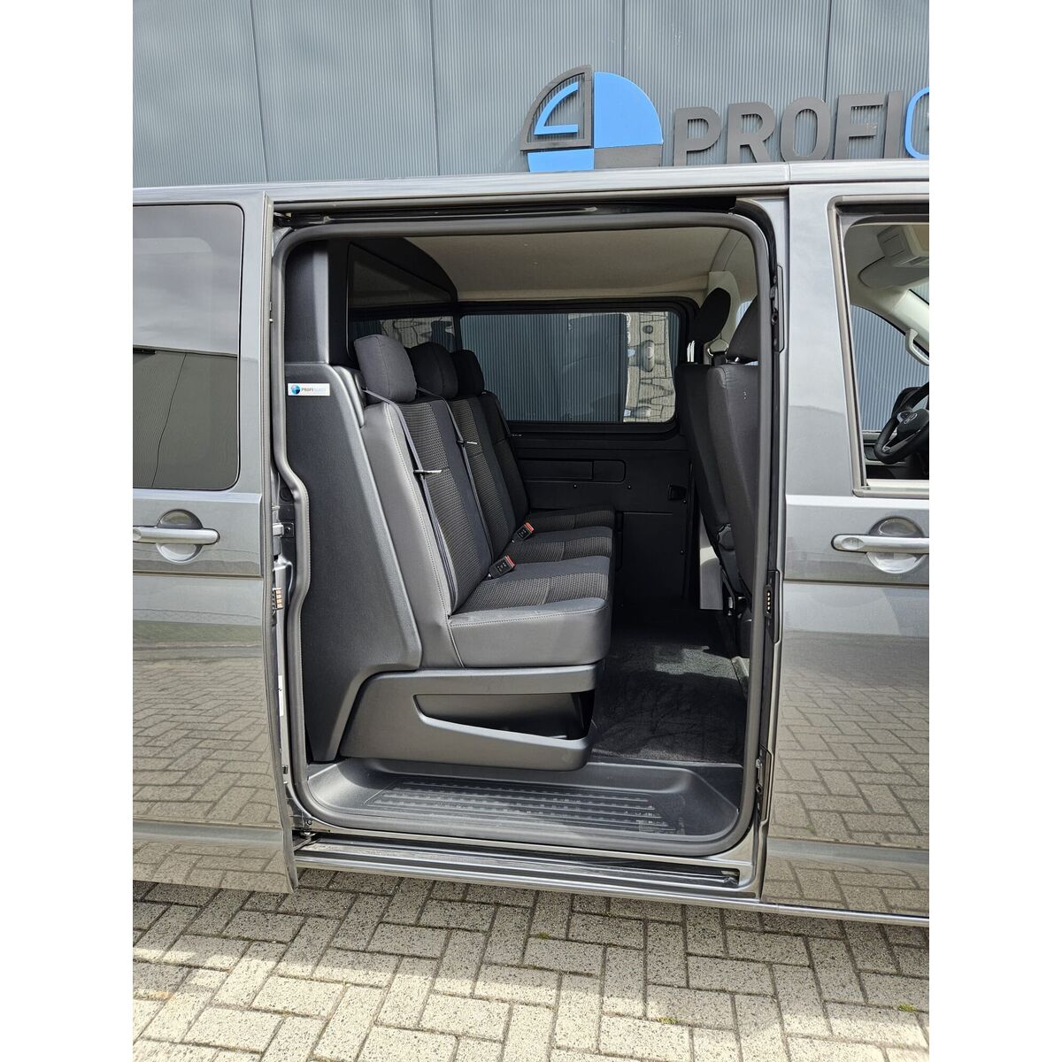 Dubbele cabine 'ProfiCab' voor de Volkswagen Transporter T6 L2H1 van 2015 tot 2019, inclusief: 3-zits bank 'Austin Black' met 3 x driepuntsgordel en 3 hoofdsteunen, ABS tussenwand met ruit, 2 zijruiten, standaard afwerking van de hemel, zijpanelen en een vloermat.