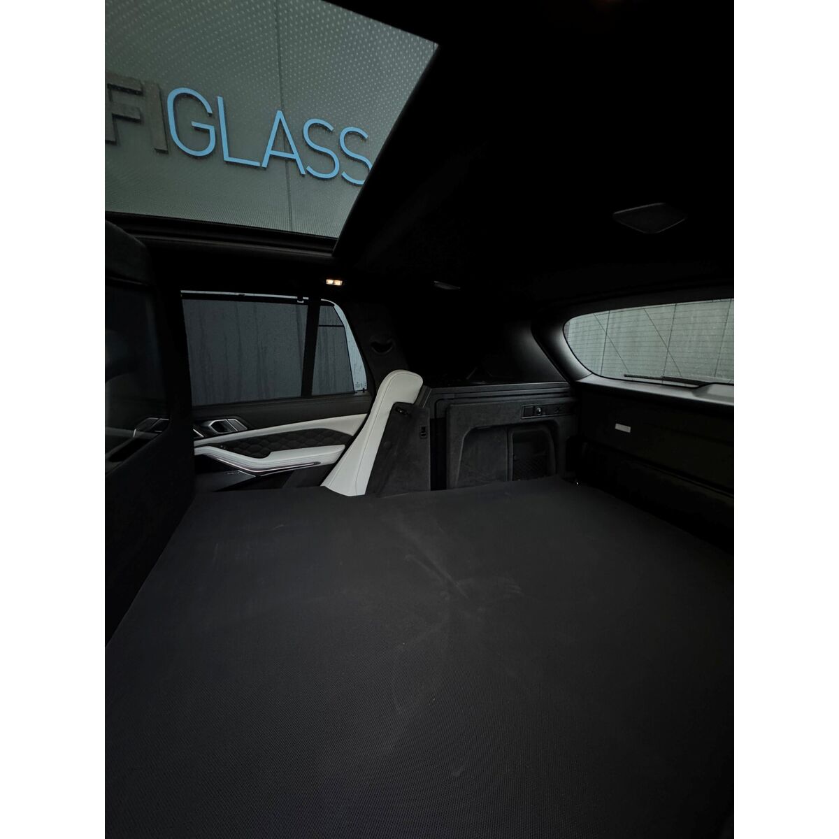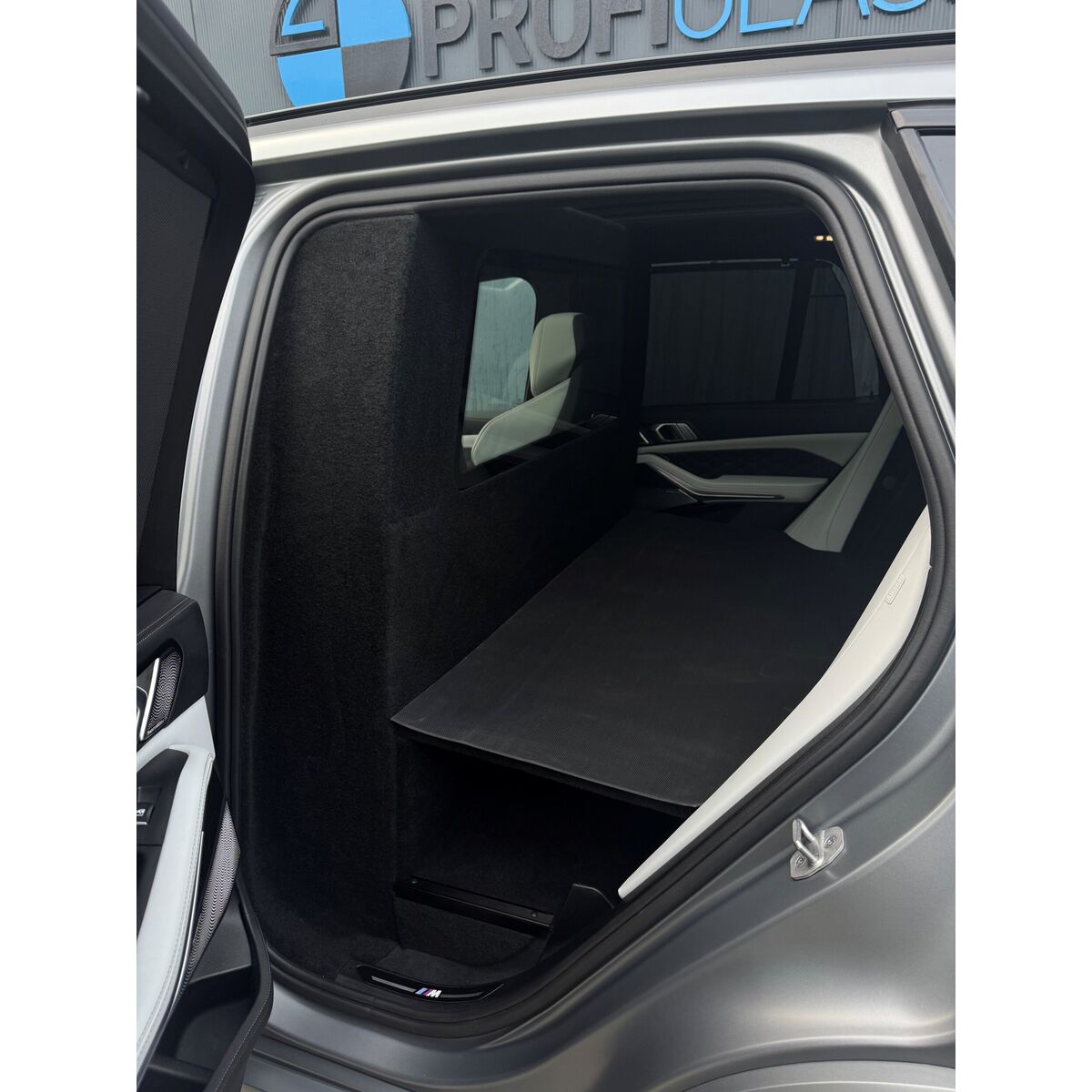 Ombouw grijs kenteken, inclusief: B-stijl wand (hout, beide zijden gestoffeerd) met brede e-keur ruit, vlakke laadvloer met mat en 4-delige set blinderingspanelen (hoogglans zwart gespoten).