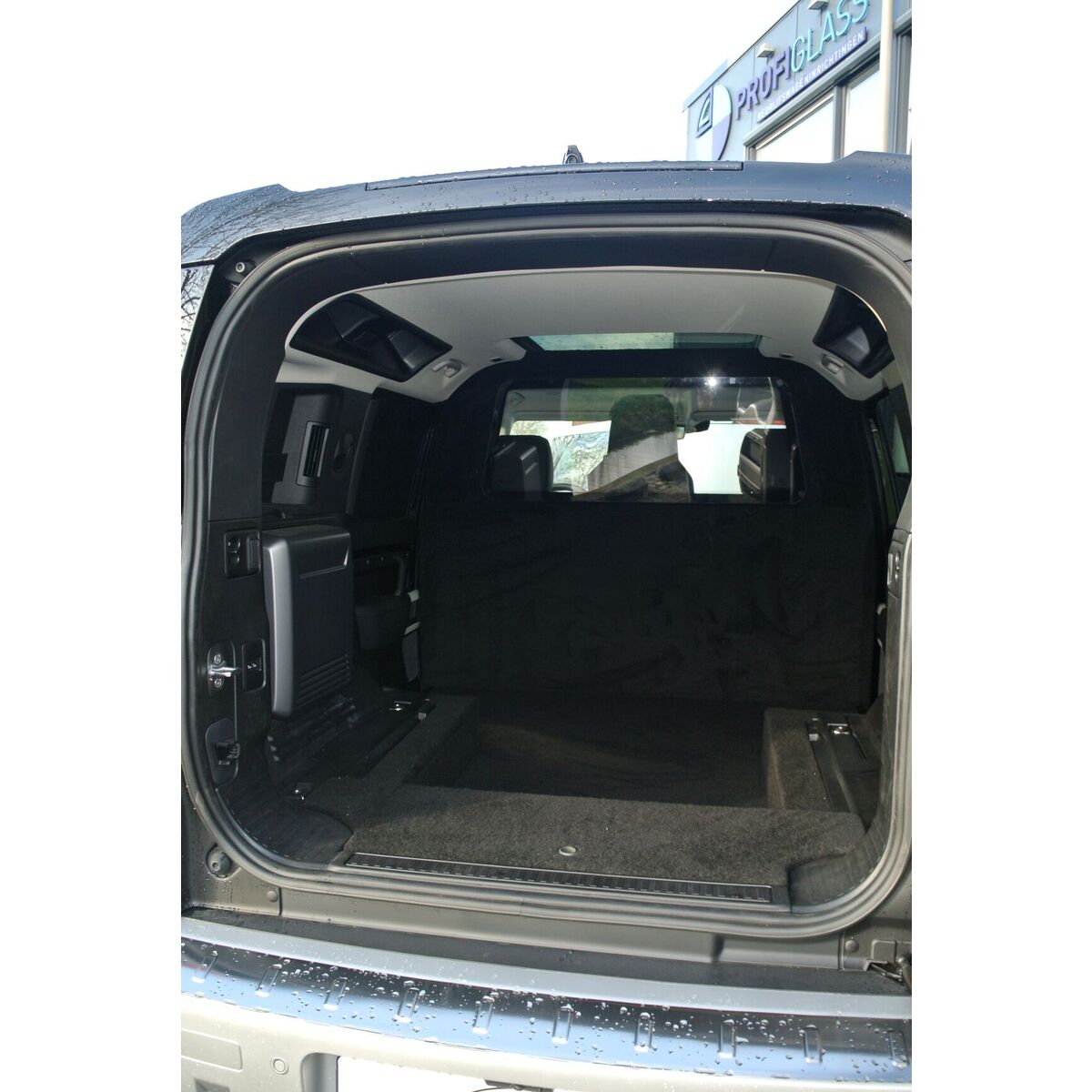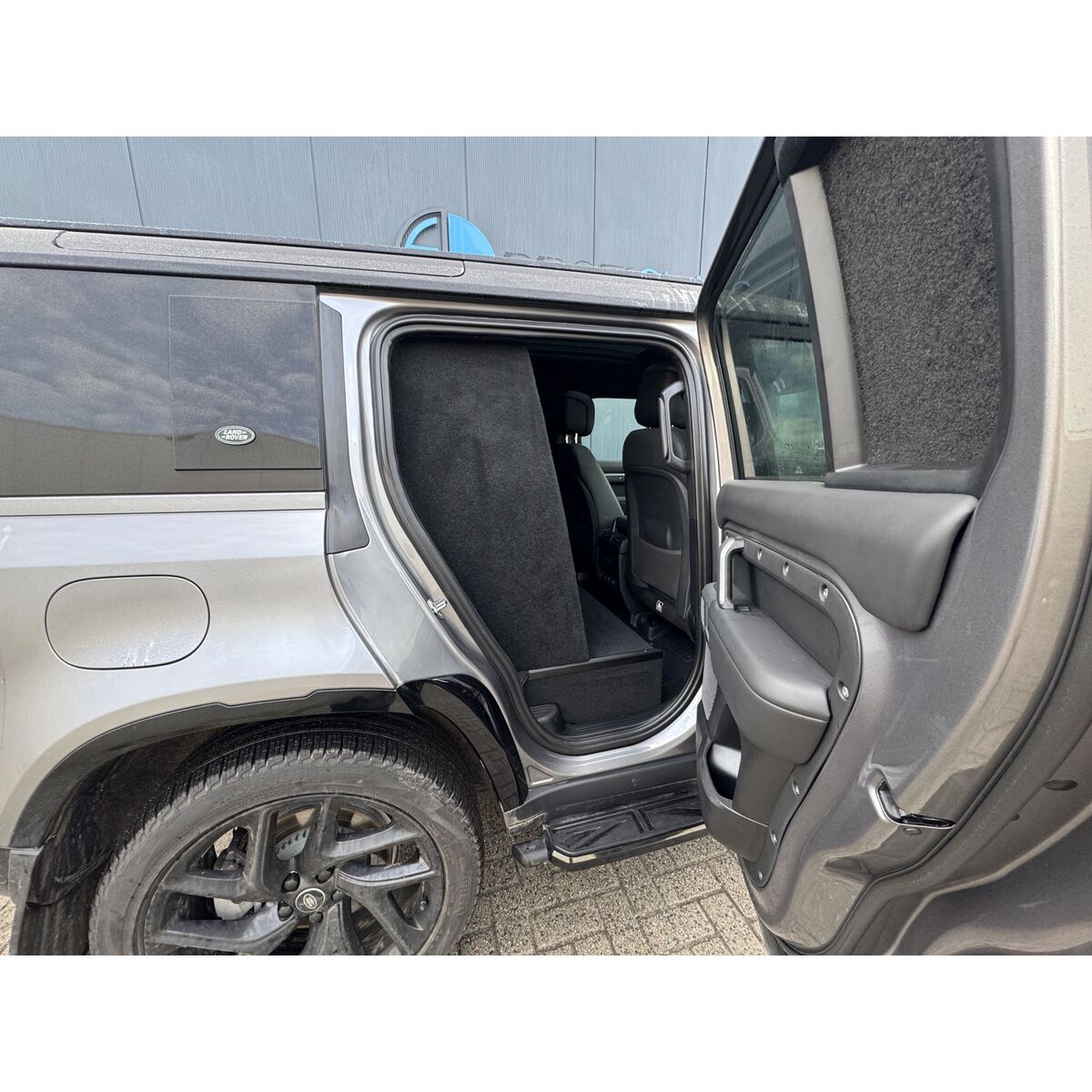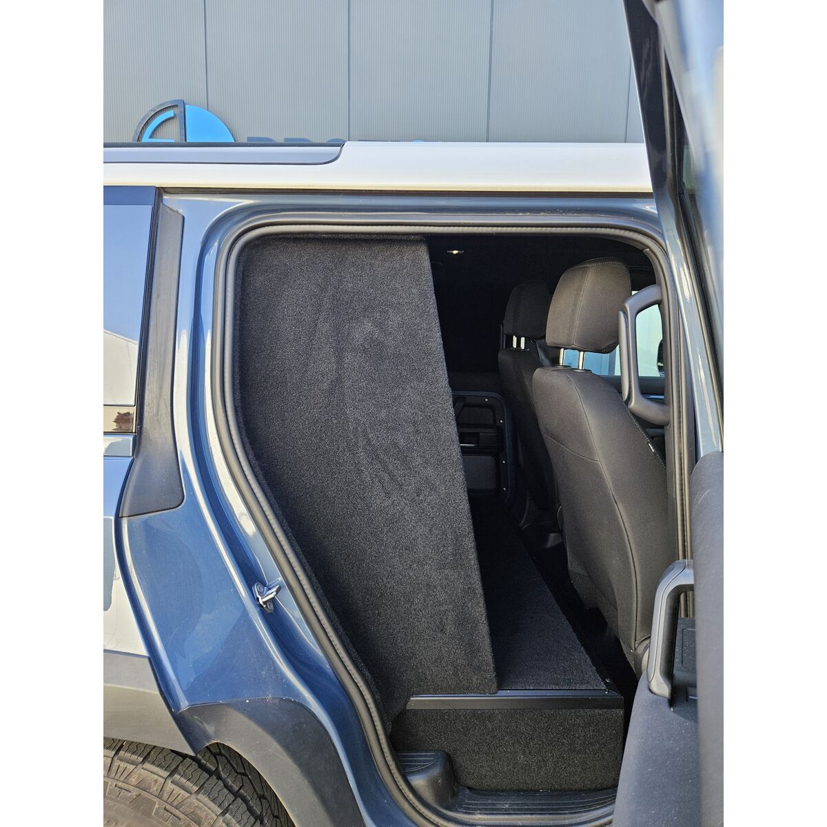 Ombouw grijs kenteken, inclusief: B-stijl wand of C-stijl wand (hout, beide zijden gestoffeerd), vlakke laadvloer en 7- delige set blinderingspanelen (hoogglans zwart gespoten).