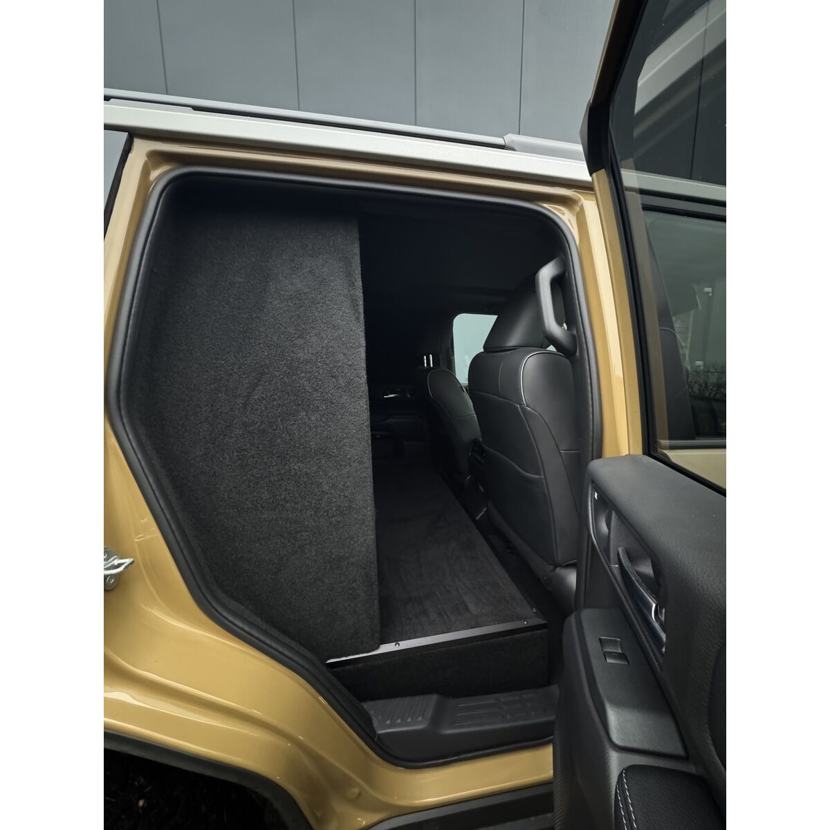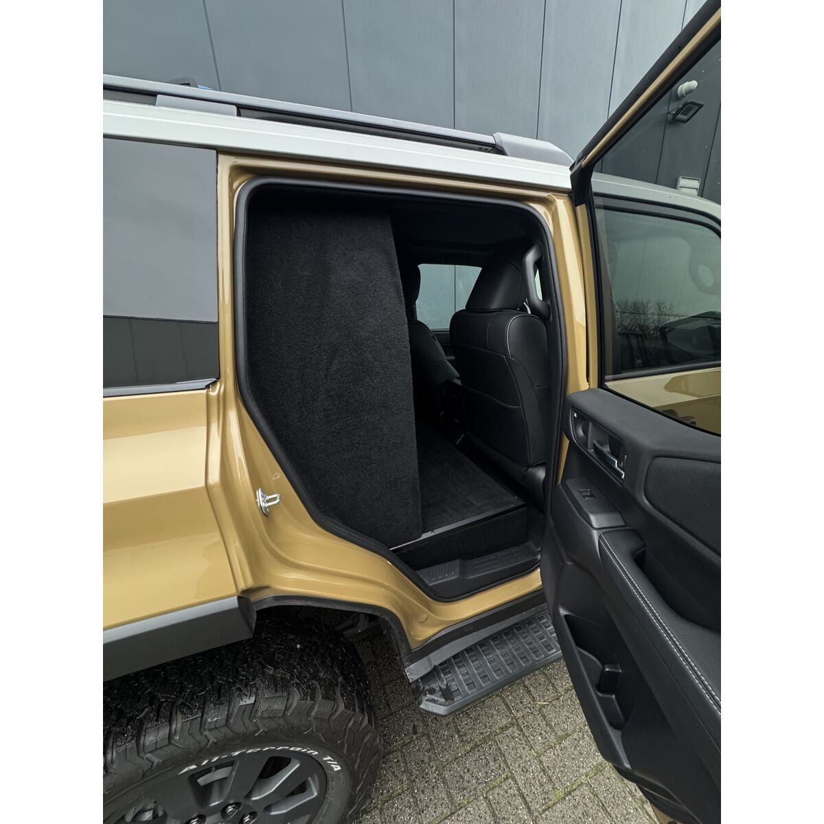 Ombouw grijs kenteken, inclusief: B-stijl wand of C-stijl wand (hout, beide zijden gestoffeerd) met brede e-keur ruit, vlakke laadvloer met mat en 4-delige set blinderingspanelen (hoogglans zwart gespoten).
