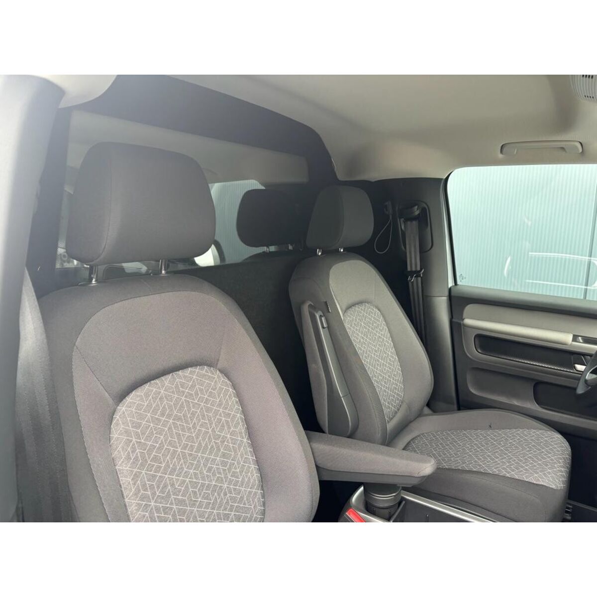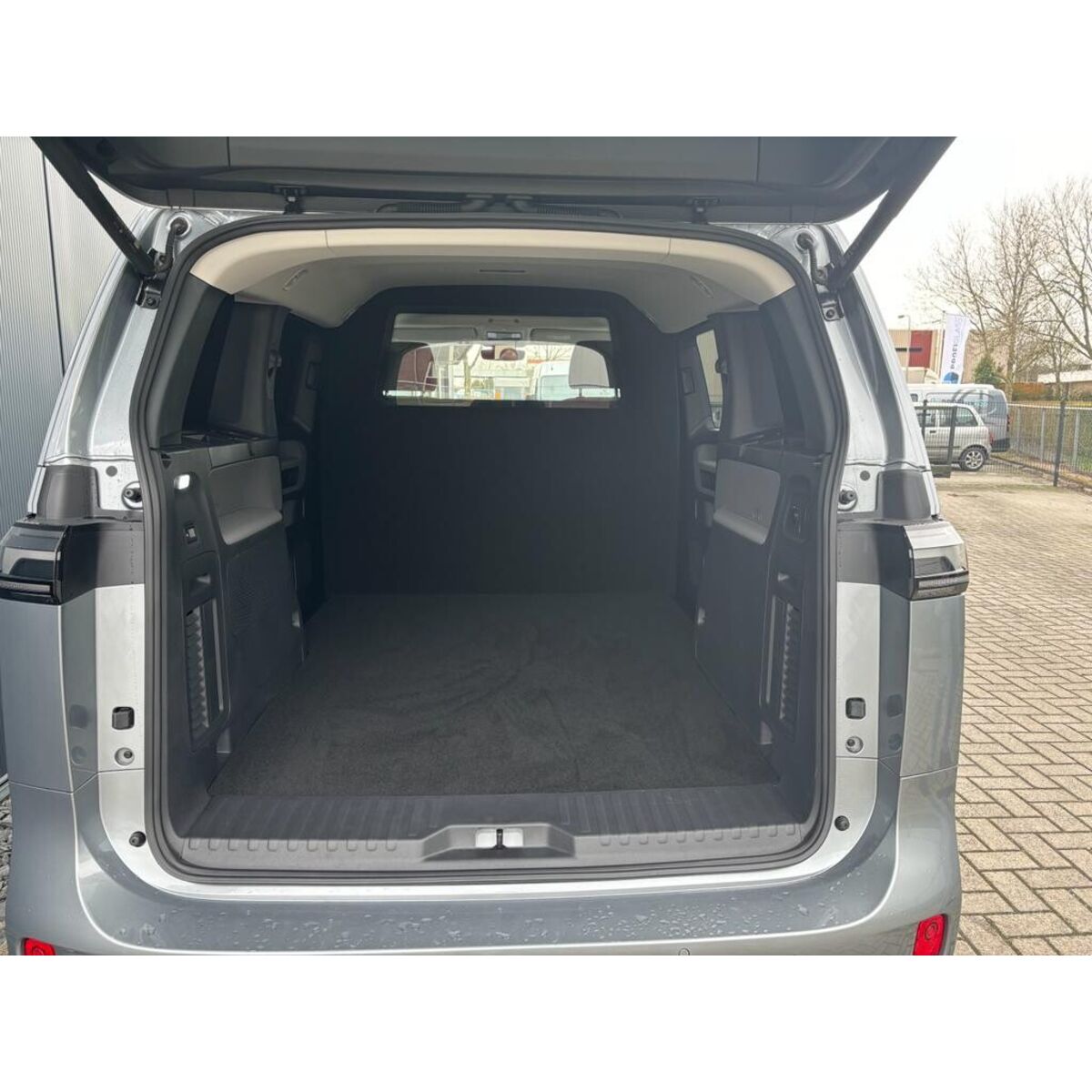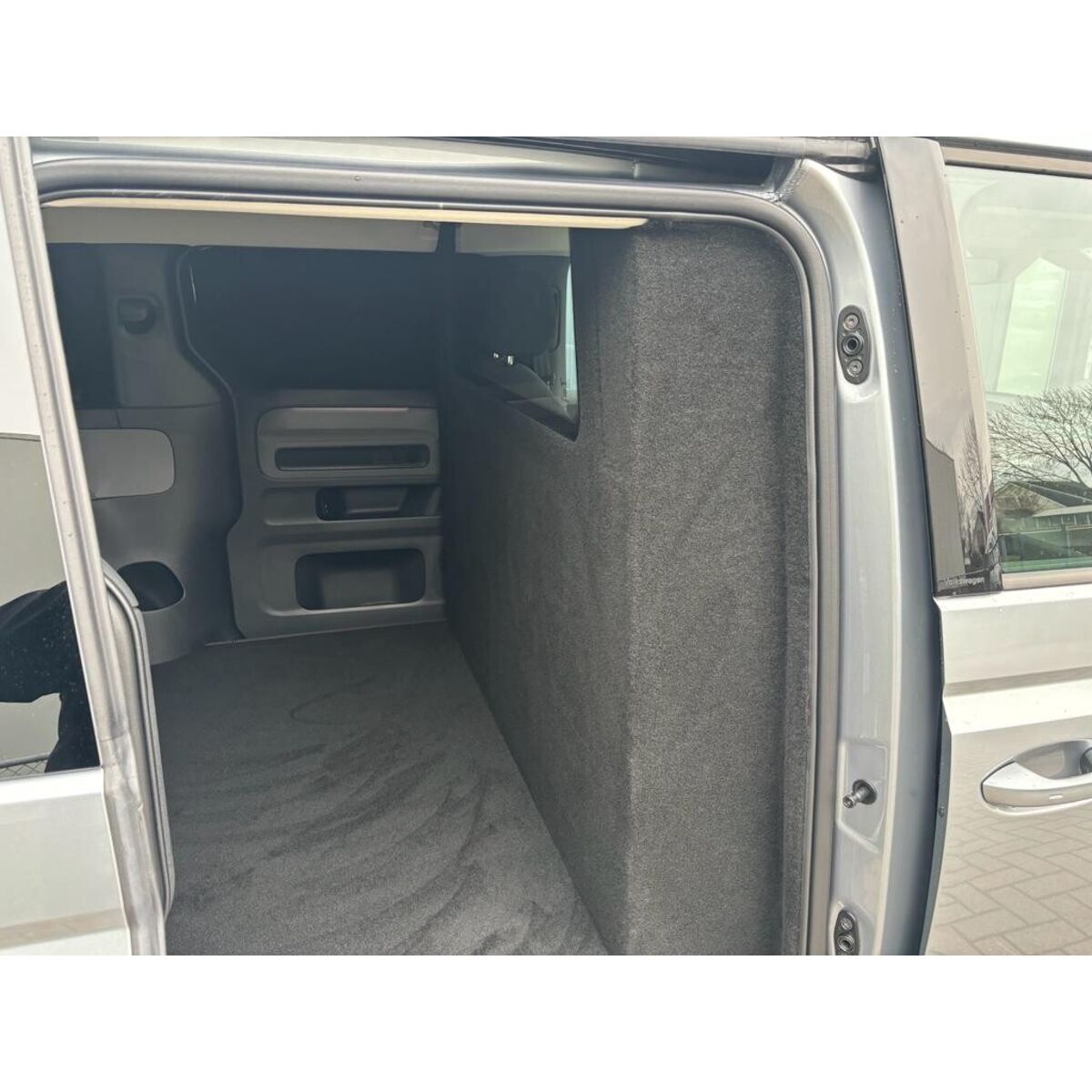 Ombouw grijs kenteken, inclusief: houten tussenwand met brede e-keur raam, beide zijdes gestoffeerd, vlakke laadvloer en 3 blinderingspanelen (links midden, linksachter en rechtsachter >> hoogglans zwart gespoten).